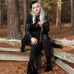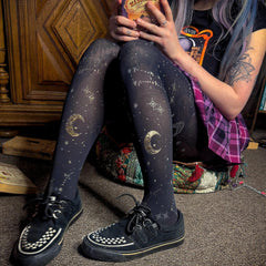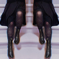 Hallow-Queen son las medias de bruja perfectas para usar. Con una base negra de 80 deniers y un diseño de luna y estrellas de ensueño en purpurina dorada, son perfectas para todo el año gracias a su hilo transpirable. No se hunden, no se enrollan ni se caen. Sutiles para cualquier ocasión, son una joya escondida que necesitas en tu colección de medias.