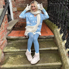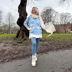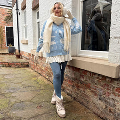 Snuggle up and meet our new Cloud Cardigan. In the same style as our sell out Rainbeaux style, our Cloud Cardi is the cosy, brand-new joy of our Stars & Clouds collection. It is a hip-length cardigan knitted in our exclusive Cloud print with a serene sky blue base scattered with fluffy white clouds and little stars.