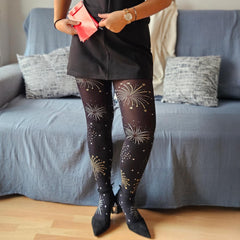 Light up the night with every step. Glitter Fireworks 80 denier tights are a full-body celebration, with shimmering silver and gold firework bursts and scattered stars dancing across a deep black base. Bold, playful and made to sparkle, these tights turn movement into a moment and every outfit into an occasion.