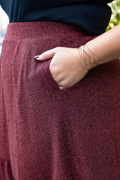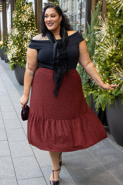 Swish onto the dancefloor with the Bordeaux Lurex Tiered Midi Skirt, your twirl-ready festive favourite. Deep burgundy lurex sparkles on the outer surface like mulled wine under fairy lights, falling in one sleek main tier before a playful lower frill kicks out for movement and fun. The frill dips lower at the back to elongate legs and frame every step in effortless glamour.