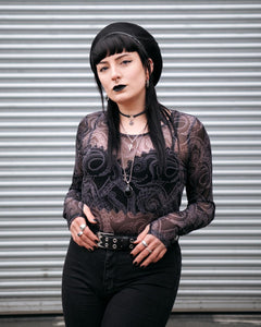 The Kraken's Embrace Mesh Top is a sheer, long-sleeved goth staple with custom tentacle artwork from our in-house team, slate-toned and coiling across a transparent black mesh base. Classic round neckline, fitted silhouette, all about drama.
