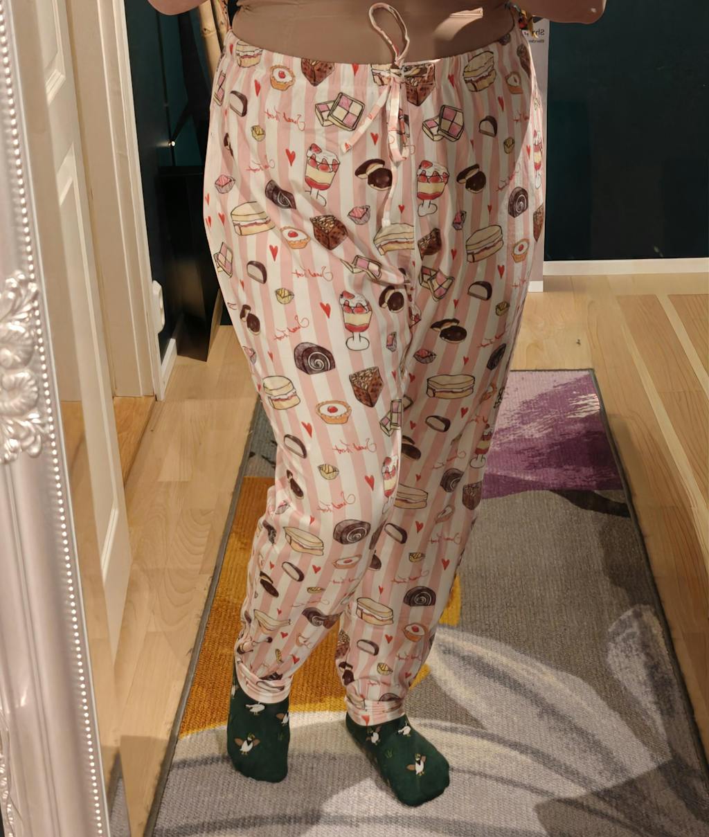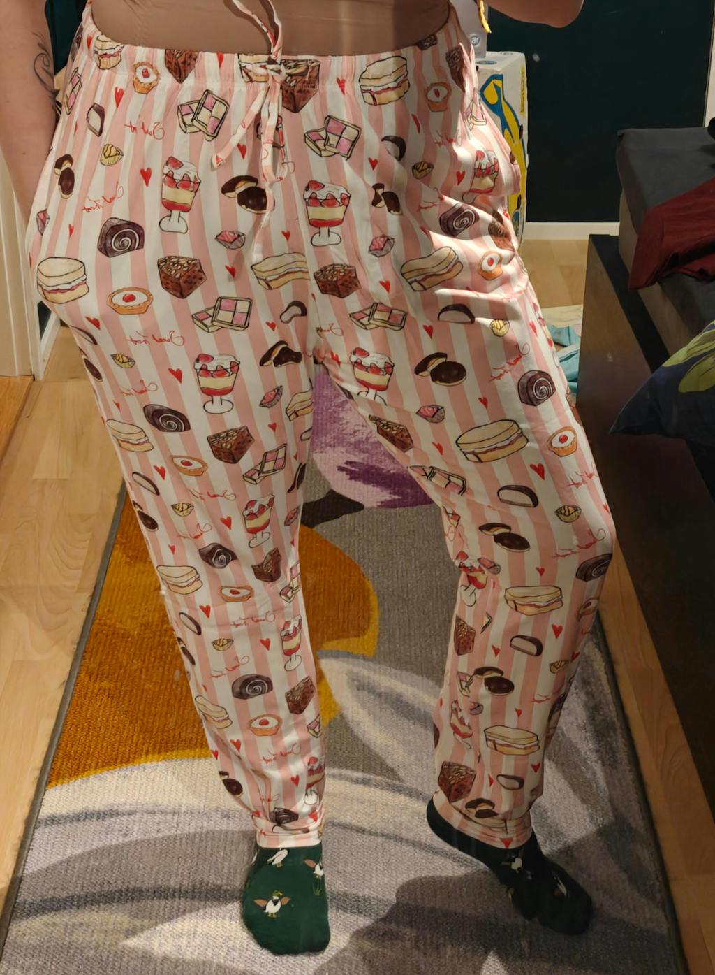 Our Sweet Treat PJ Bottoms make bedtime feel like the best tea party ever. A proper celebration of Britain’s finest cakes and puddings (think Battenberg, Bakewell tart, Victoria sponge, chocolate Swiss roll, trifle, French fancies and a scattering of tiny hearts) all tumbling across soft pink and white candy stripes.