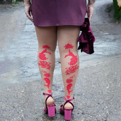 Soft, sheer and full of good fortune, Paper Cut Caramel Latte tights are here to turn heads from behind. With a bold lucky red design knitted into a sheer 30 denier Caramel Latte base (our warm, sun kissed skintone shade), these tights are equal parts delicate and dramatic.