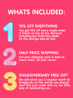 Snaggiversary Free Gift 🎁 We will email you a voucher worth 10 Snagbucks on the date you placed your first ever order with us, our little way of celebrating you.