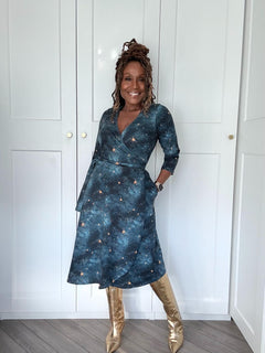 Twirl into wonder and meet the Nebula Wrap Dress. It is crafted from our luxurious cotton jersey in the exclusive Nebula Stars print with swirling smudges of deep blue and teal dotted with a scattering of golden stars.