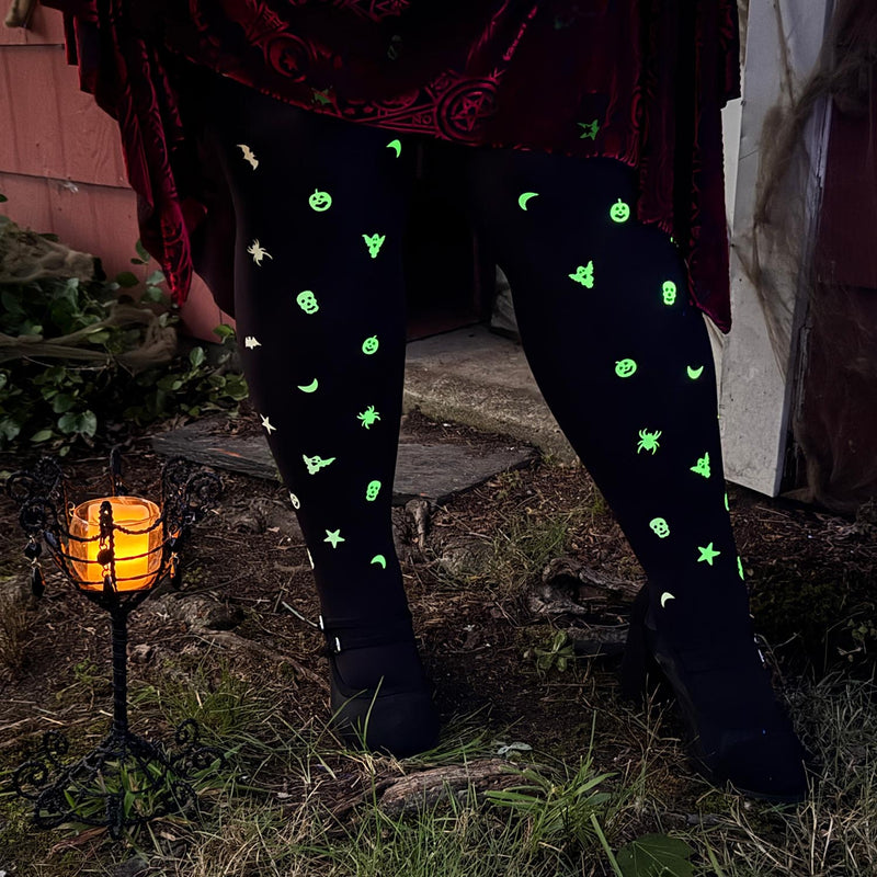 Deja que el verdadero espíritu de Halloween brille con Glowsty: ¡nuestras primeras medias reactivas a los rayos UV que te darán un toque espeluznante en las piernas! Con un diseño cautivador de fantasmas, calabazas, estrellas y calaveras, acércate a una luz ultravioleta para ver cómo estos espeluznantes patrones cobran vida en la oscuridad.