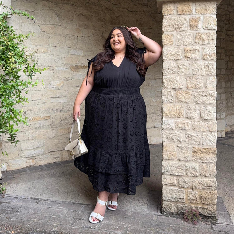 This is elegance you can truly live in. Our midi dress features a stunning, all-black Broderie Anglaise embroidery on its full skirt, giving it a beautiful texture that’s sophisticated without being overstated.