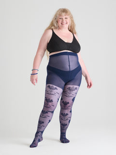 ¡Brujas, prepárense! Lucen la mejor vestida de su aquelarre con nuestras medias inspiradas en libros de hechizos. Hemos desarrollado una técnica completamente nueva para confeccionarlas. Comienzan con una base de malla y permiten tejer patrones detallados inspirados en el rebaño en la parte superior. ¡Imagínense unas redes de pesca muy resistentes con hermosos patrones en la parte superior! Perfectas para lanzar hechizos.