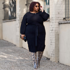 Presentamos el vestido Snag Cocoon en un elegante negro. Confeccionado con nuestro tejido de punto característico, este vestido ofrece una comodidad envolvente y un ajuste favorecedor para todas las figuras. Su elegante largo midi llega justo por debajo de la rodilla, mientras que el lazo extraíble en la cintura te permite transformar tu look en segundos. Ajústalo para definir la cintura o llévalo suelto para un look fluido y relajado.