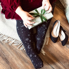 Step into a winter night sky with Winter Solstice, our dreamy 80 denier tights that sparkle with celestial magic. Set on a smooth black base, these tights are scattered with silver glitter crescent moons, twinkling stars and delicate snowflakes in mixed sizes, creating a shimmering scene that feels like gazing up at the constellations through a gentle snowstorm. Enchanting, elegant and a little bit otherworldly, they bring instant festive wonder to any outfit.
