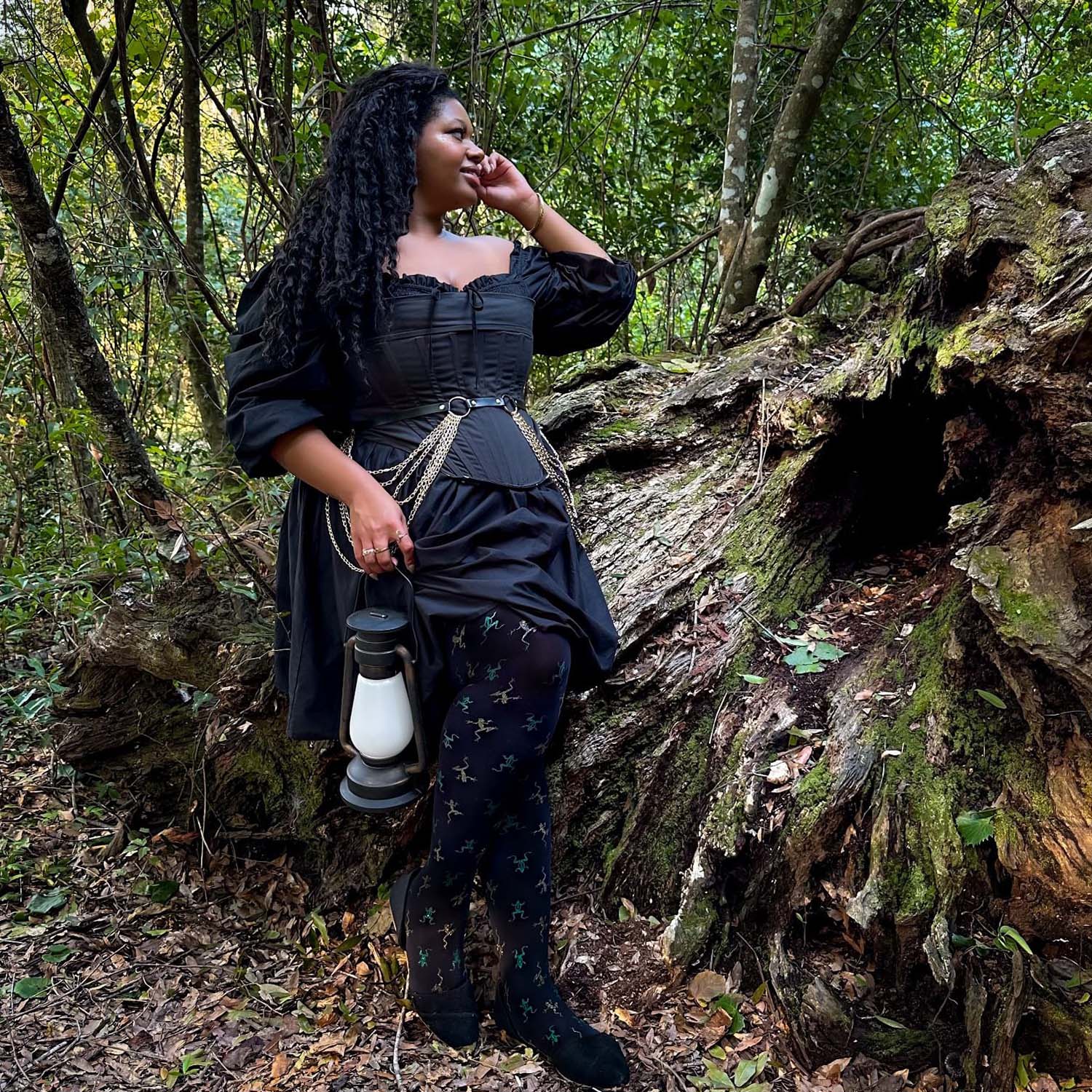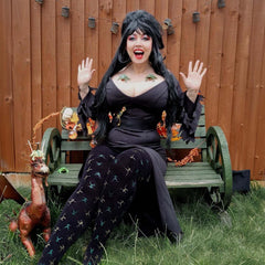 Eye of Newt and Toe of Frog... but with glitter! Adorned with the likeness of the elusive poison arrow frog, Dart are frog tights that glitter as if touched by the very stars themselves. Each teeny amphibian figure appears almost alive, ready to leap from the fabric into the shadows of the night. A black base, with green and gold frogs scattered across the legs, these are your new favourite Autumn tights.