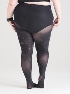 Hallow-queen are the perfect wearble witchy tights. A black 80 denier base with dreamy moon and stars design in gold glitter. Perfect all year round thanks to breathable yarn. No digging, in, no rolling down or sagging. Subtle enough to be worn for all occassions, these are a hidden gem that you need in your tights collection.