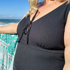 This is the I'll Be Right Here Swimsuit in black and this is designed for support and style. With a power mesh lining at the bust cups and soft swim jersey from the under bust to the panty. There are adjustable straps and a hook and eye back closure for customisable fit, and lightly padded, fully integrated cups. It's finished with a small metal Snag decal and arrives in it's own drawstring bag made from leftover fabric and trims.