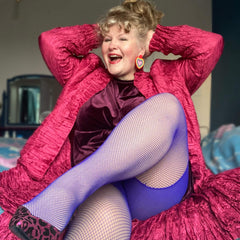 Thighs the Limit fishnet tights in Arabesque blue seamlessly integrate fishnets with chub rub shorts. Crafted from the same Snag robust fishnet knit, but with the benefits of wearing a pair of Chub Rub shorts, these are the comfiest fishnets. Moisture wicking, breathable and designed to keep you a degree cooler at the top, with a super stretchy fishnet at the bottom.